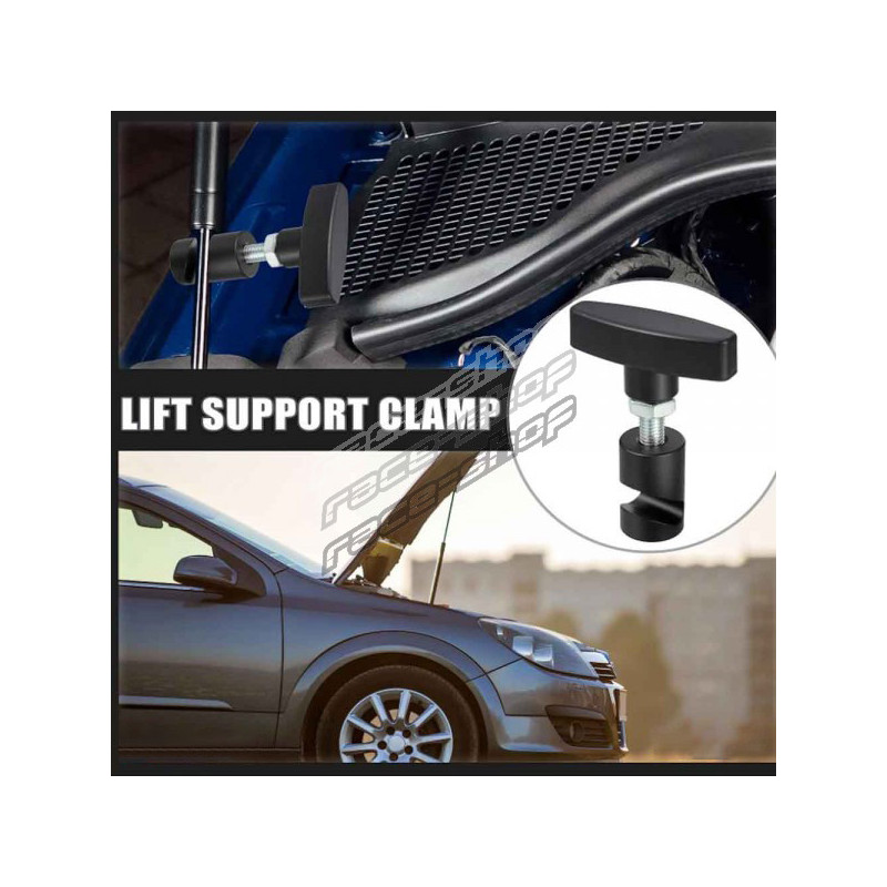 Car hood lift strut clamps to prevent the open hood from falling in the case of strut failure.