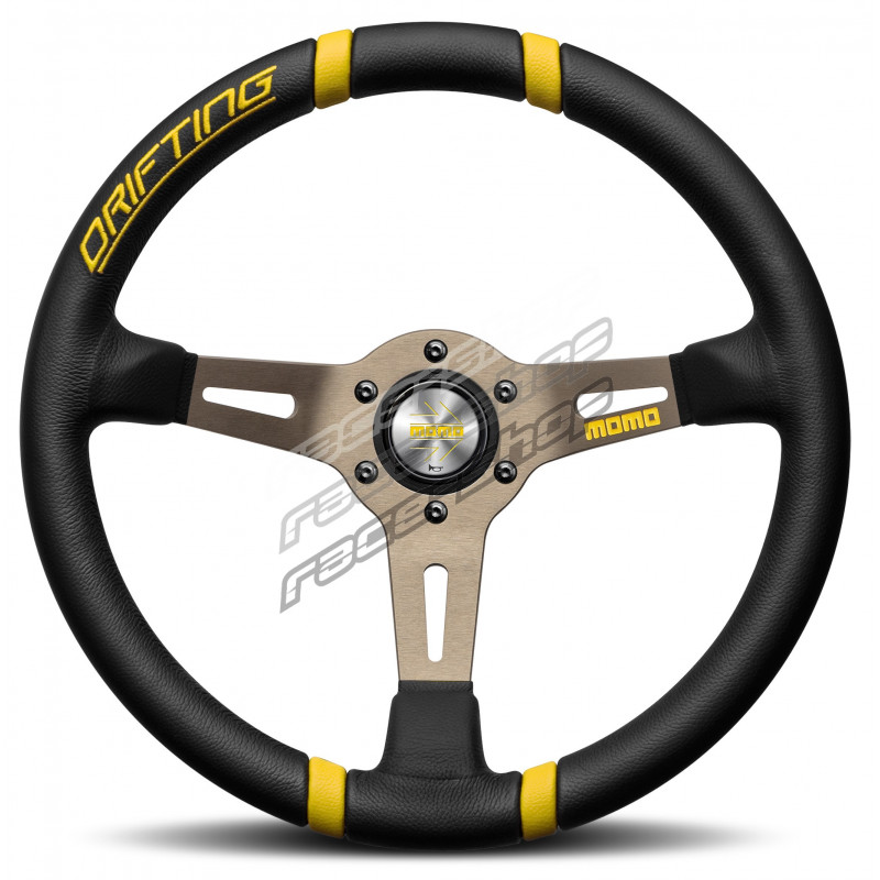 Come il suo gemello, il Drifting offre le stesse caratteristiche prestazionali del Drifting arancione con dettagli gialli a contrasto. Simile per struttura e design, questo volante presenta inserti in pelle per indicare il posizionamento del volante. Il raggio destro presenta il logo MOMO con la scritta "Drifting" ricamata sull'impugnatura.