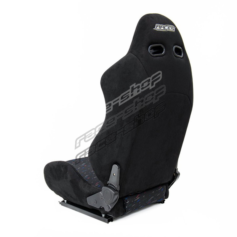 Sedile sportivo regolabile universale Races Confetti con un design ispirato agli anni '90, forte imbottitura laterale e un cuscino confortevole per la guida a lunga distanza. Materiali in tessuto e suede con cuciture nere.