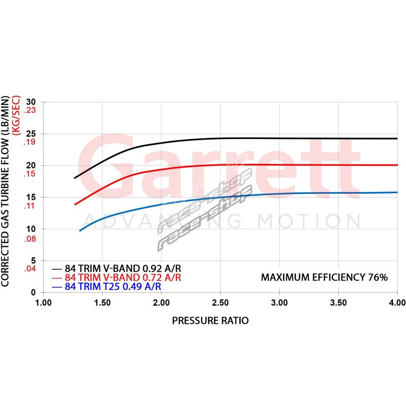 The new turbine wheel flows 15-20% more than GTX and has peak efficiency of 74%.