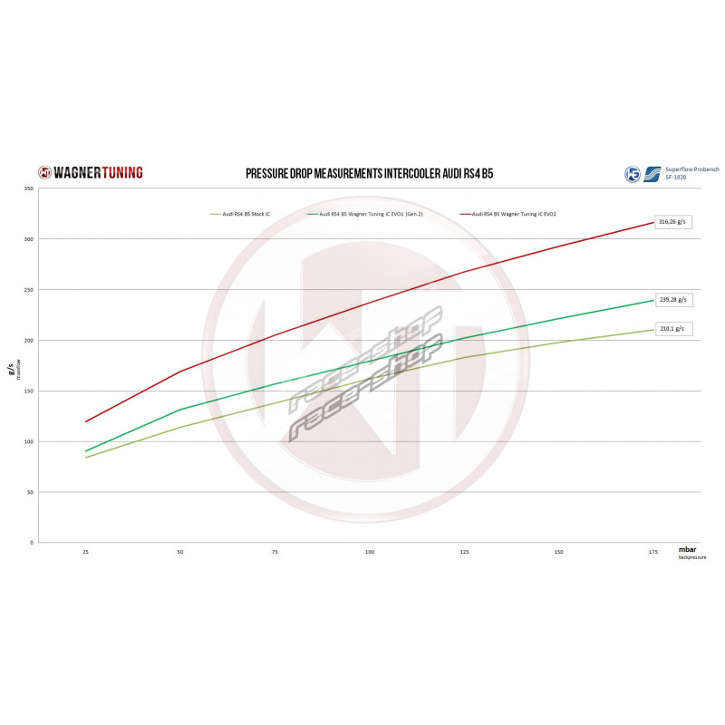 WAGNERTUNING L'intercooler ad alte prestazioni è dotato di un nuovo nucleo da competizione (ultima tecnologia Tube-Fin-Technology) con le dimensioni 255 mm x 260 mm x 120 mm (7.95 litri) / 10,0Inch x 10,2Inch x 4,7Inch (479,4Inch³), che è stato sviluppato specificamente per gli appassionati di RS4 B5 con auto ad alta messa a punto. Questo nucleo ad alte prestazioni offre una superficie frontale del 43% più ampia e il 147% in più di volume del nucleo rispetto a l'intercooler in stock.