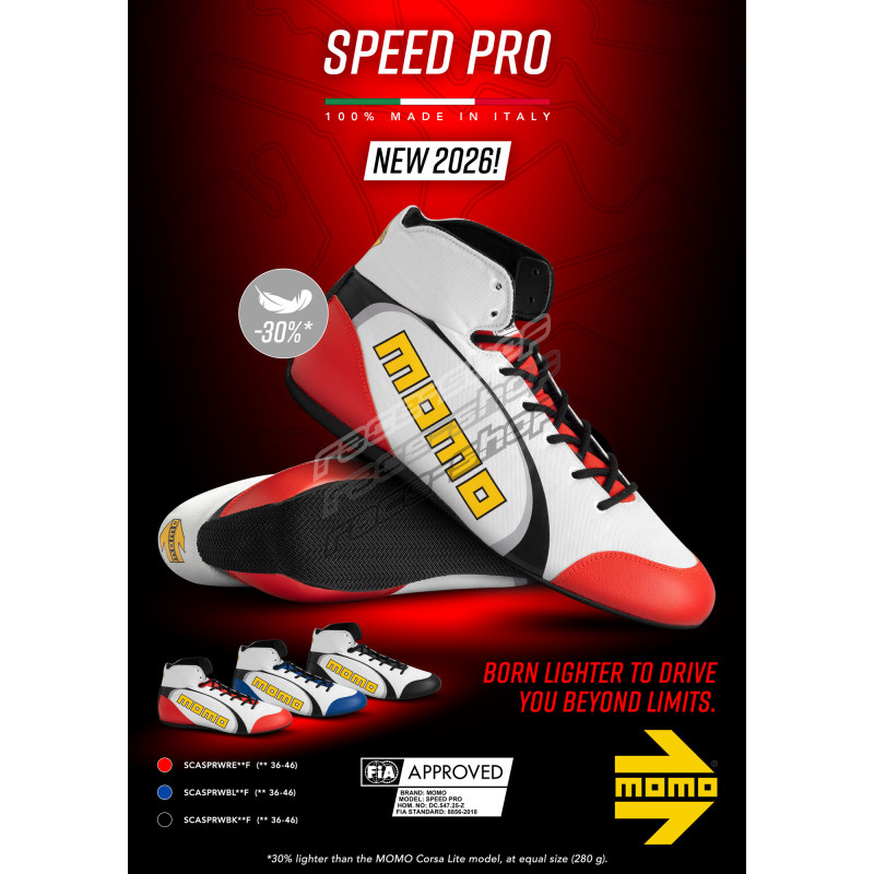 Offered in three striking variants (red, blue, and black) on a white base, and available in EU sizes 36 to 46, the MOMO Speed Pro can also be customised in selected colours to match team liveries or personal style.