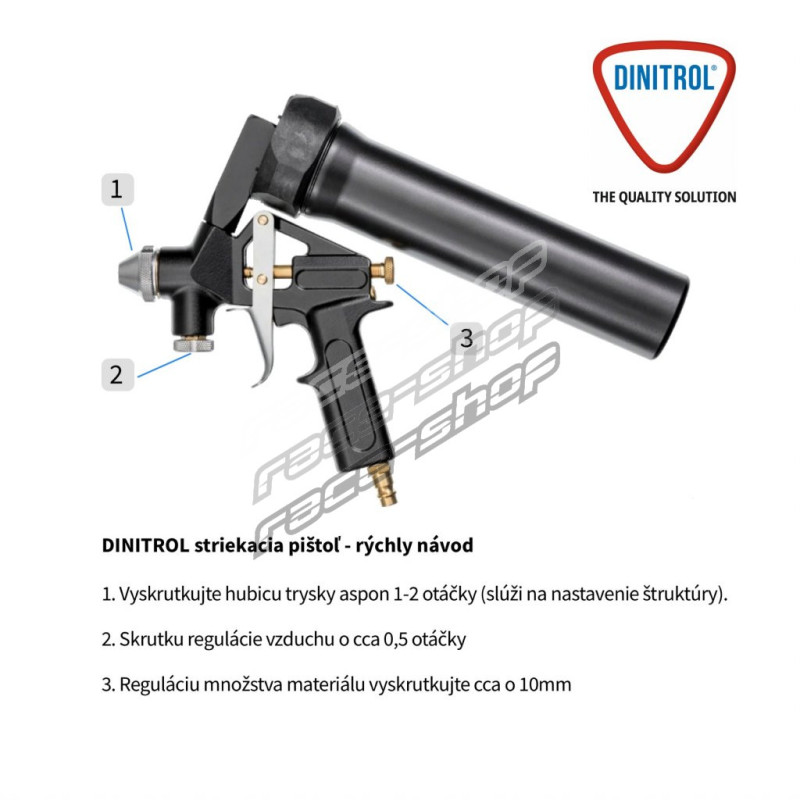 Progettato per la spruzzatura e l'estrusione di materiali sigillanti e fonoassorbenti (DINITROL 750 in una confezione di cartuccia da 310 ml). Permette di regolare la quantità di materiale e la sua spruzzatura, ottenendo così le strutture desiderate, come con le superfici OEM originali di sottoporta, parafanghi e telaio verniciati a spruzzo. .