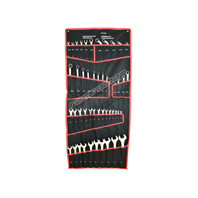 47 piece large set of different types of combination wrenches. Set includes: Combination Spanners, E-TORX Ring Spanners, Ring Ended Spanners, Half-Moon Crescent Ring Spanners, Flare Nut Spanners.