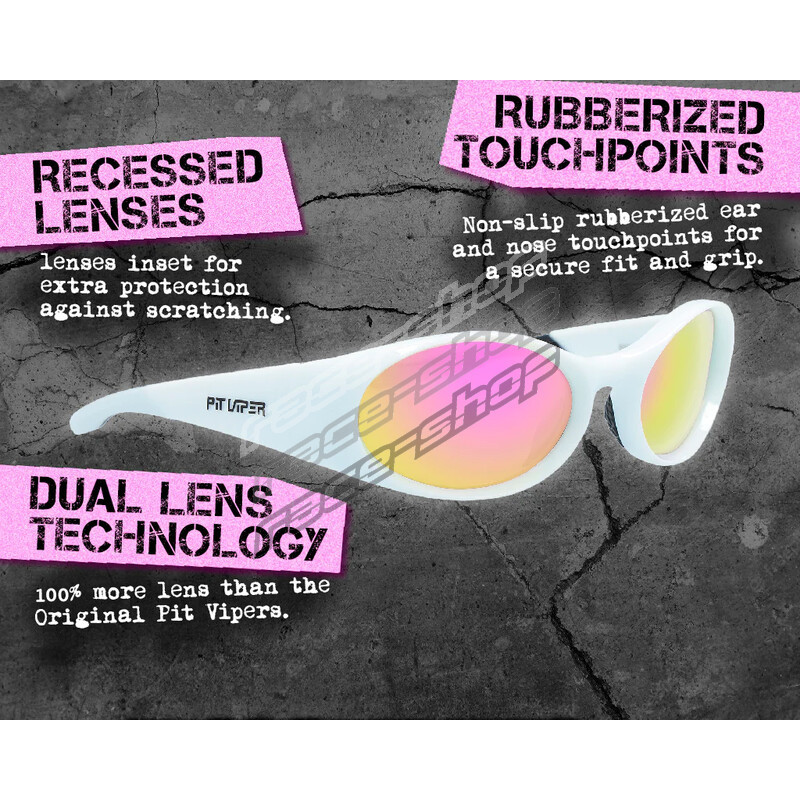 Pit Viper sunglasses are designed to deliver unmatched durability, protection, and bold style in any environment. They meet ANSI Z87+ standards against impact, non-ionising radiation, chemicals and liquid splashes. Engineered for high-performance activities, they feature impact-resistant hard plastic or polycarbonate lenses with full UV400 protection, ensuring your eyes stay safe from harmful UVA and UVB rays. The adjustable arms and nose pieces provide a secure, custom fit, whether you're skiing, cycling, partying, or working outdoors.