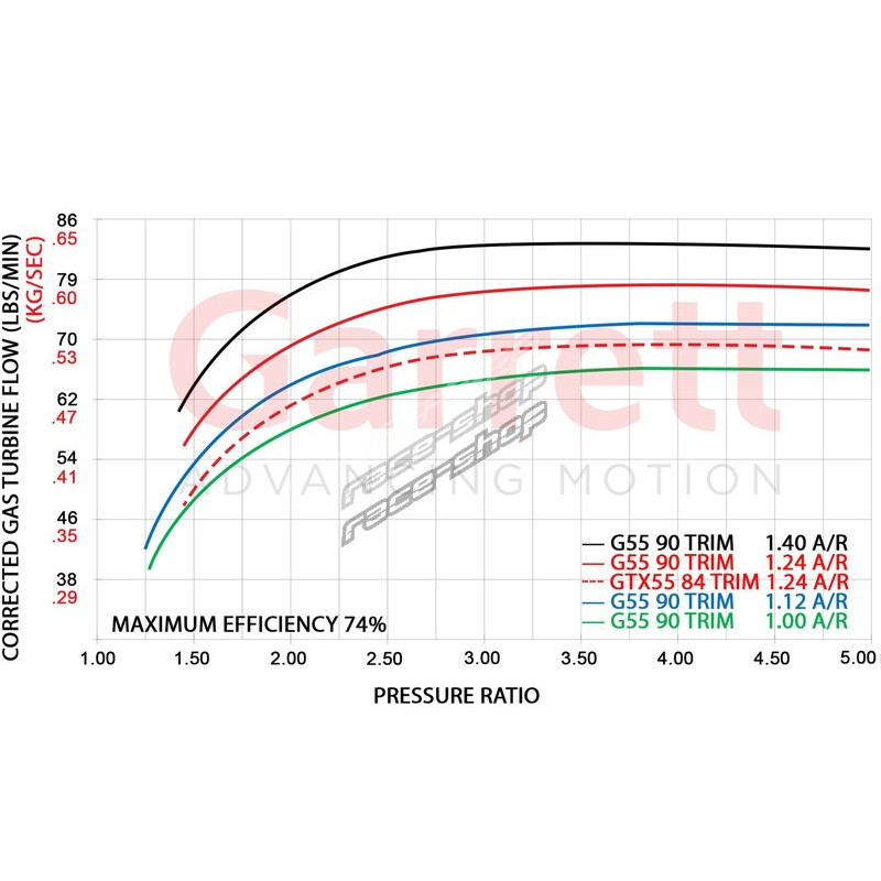 Garrett G55 compressor stages are offered in 85m, 88mm, 91mm, 94mm, 98mm, 102mm, and 106mm inducer sizes each with their own horsepower ratings indicated in the model name.