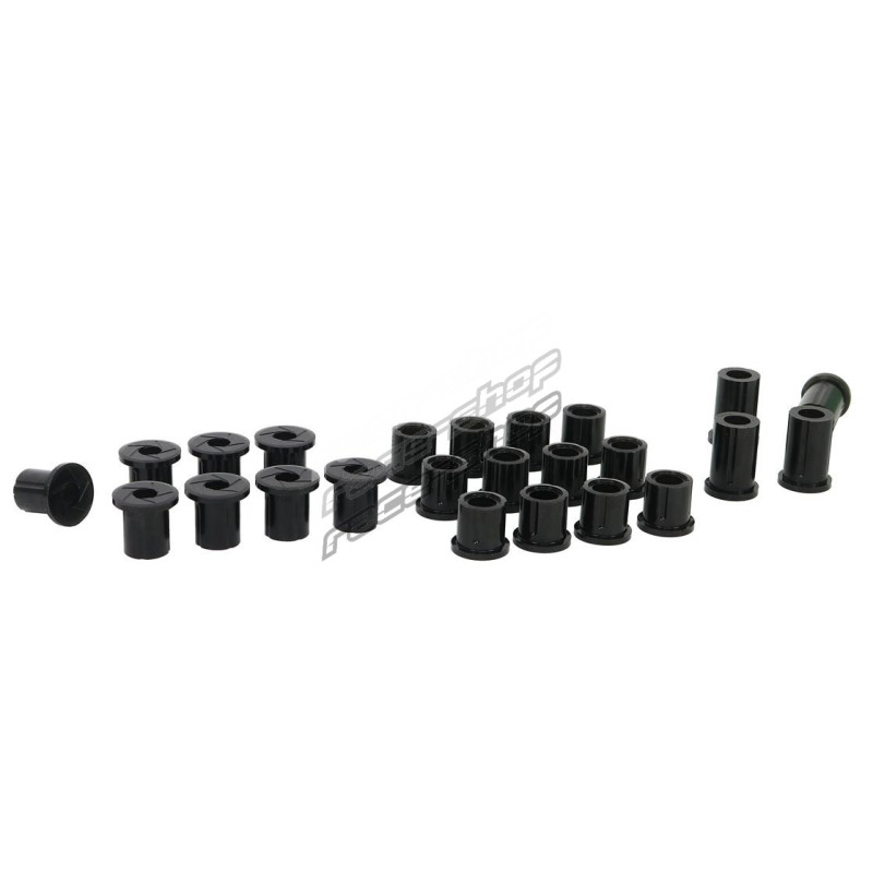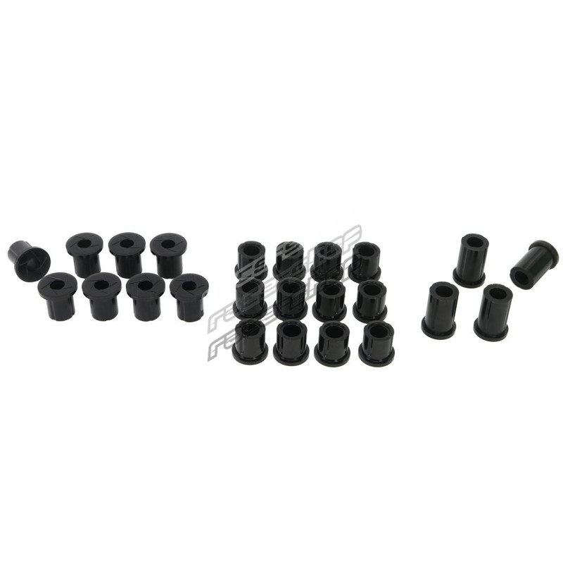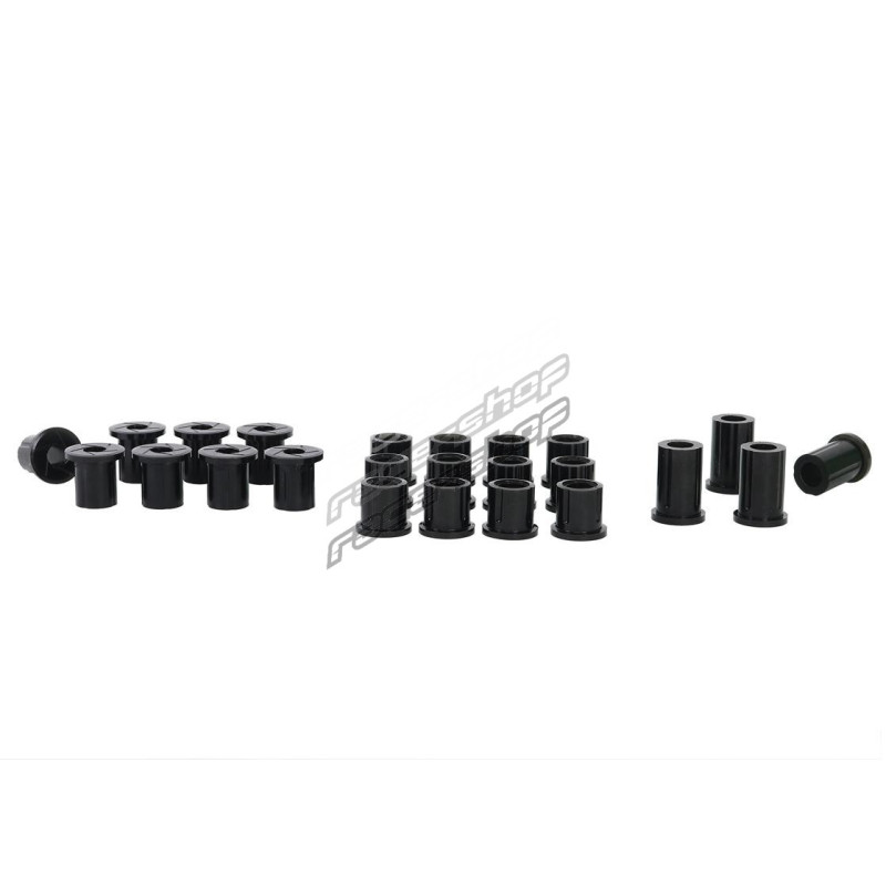 These bushings are often overlooked when upgrading the suspension of a 4WD.Leaf spring bushings stabilise the movement of the rear axle, inferior bushes in this area will cause the solid rear axle to move and impart rear end passive steer to the vehicle.It also causes the vehicle to ""wander""all over the road and be unstable under heavy braking.This can be especially noticeable carrying a load or towing a boat or caravan.The OE rubber style bushes are designed to work at standard height with standard tyres and with standard loads.By fitting SuperPro Bushings and upgrading to Greaseable Shackles the rear end of your 4WD will handle just about anything you can throw at it!