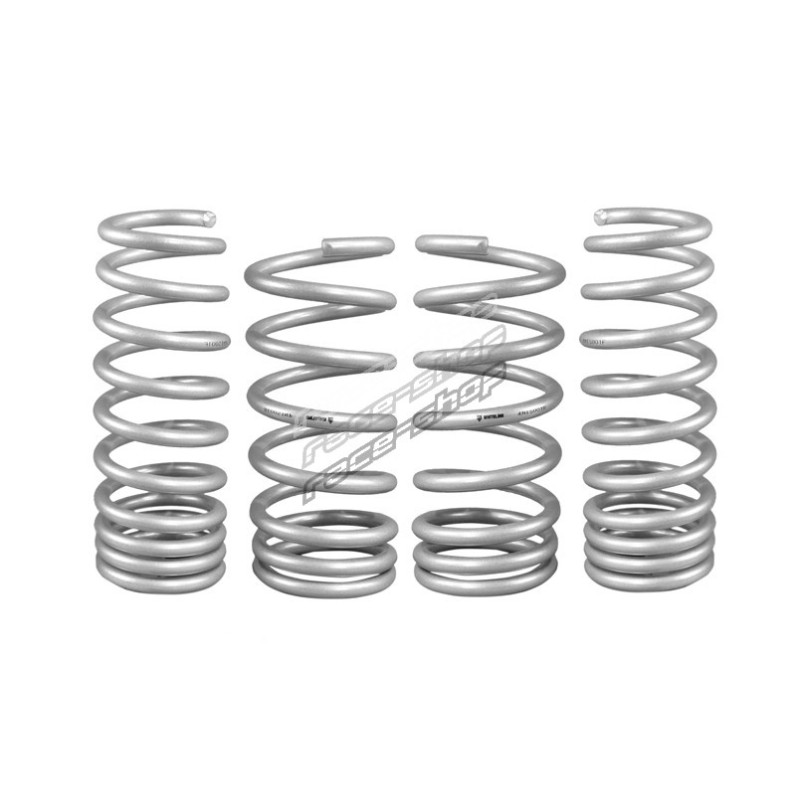 Whiteline Springs deliver improved vehicle performance whilst maintaining safety and ride quality characteristics. This kit contains 6.4kg/mm (258lb/in) front rated springs that provide a 25mm drop while the 7.0kg/mm (392lb/in) rated rears deliver a desirable 25mm to the vehicle. By lowering the vehicles centre of gravity, the unique and progressive rate coil design not only improve performance but enhance overall appearance. Developed and manufactured in Europe from the highest quality materials, coating and to the finest tolerances guaranteeing exact fitment. Whiteline Springs are engineered for optimal balance with OEM and aftermarket shocks. For total grip activation match with Whiteline Sway Bar and Essentials kit for unrivalled handling and optimal vehicle performance.